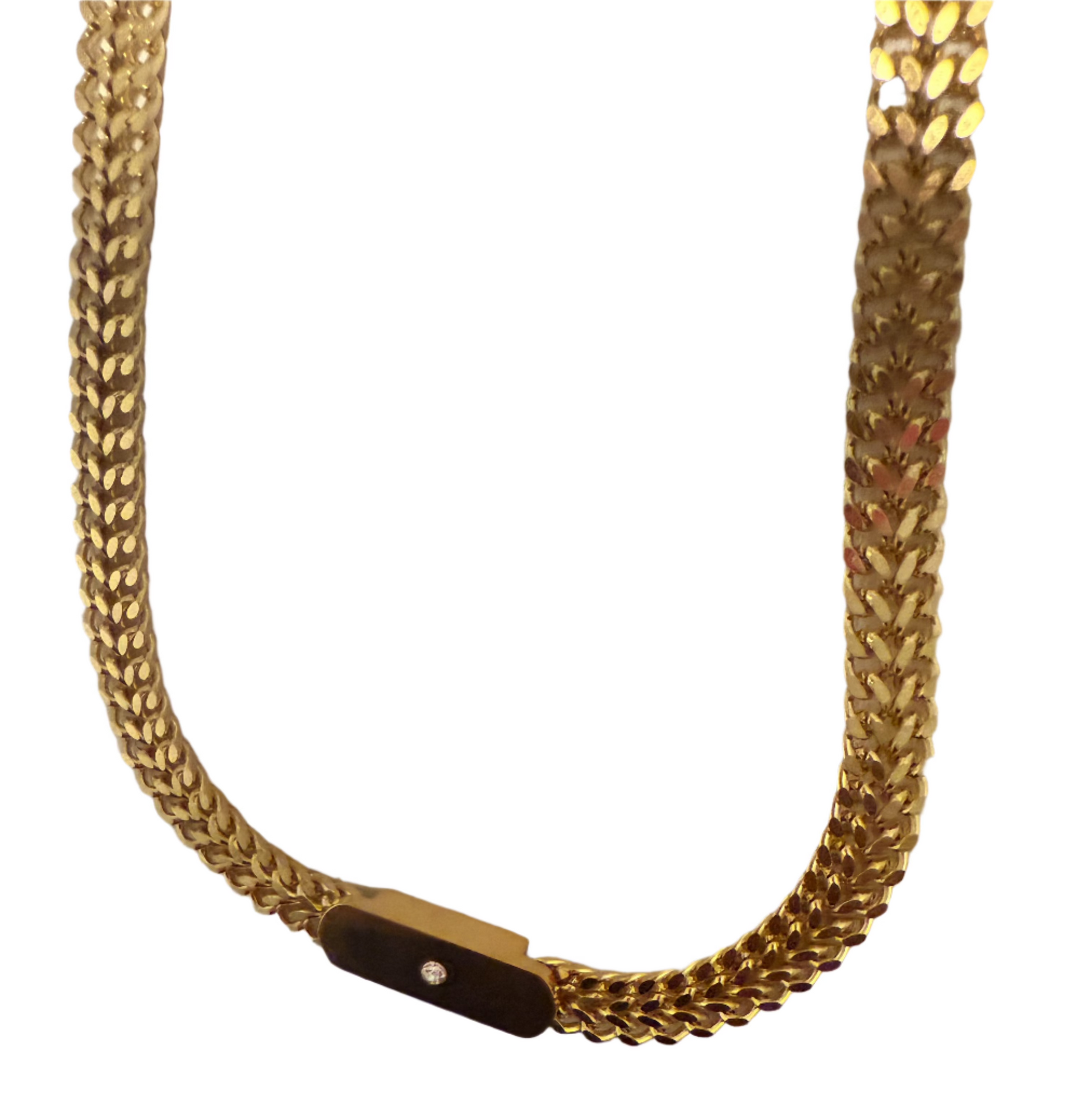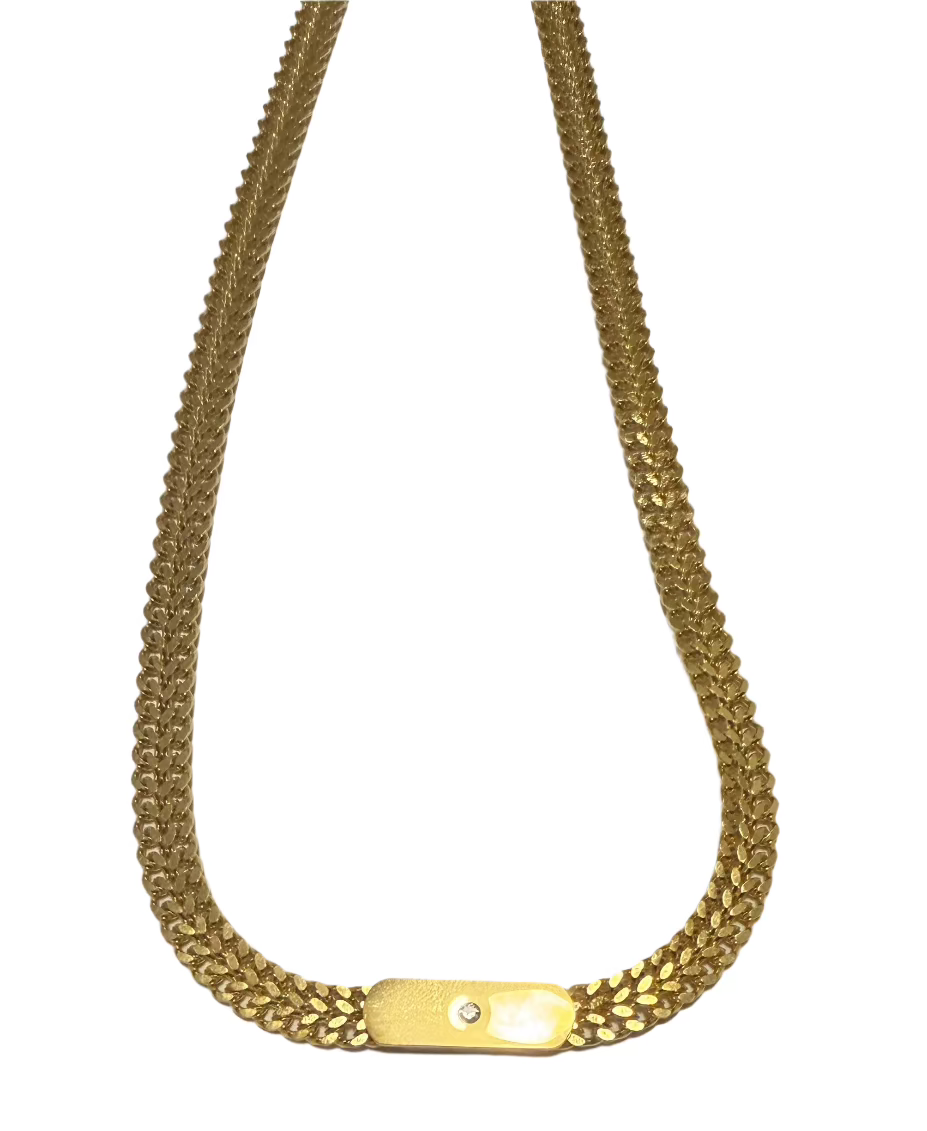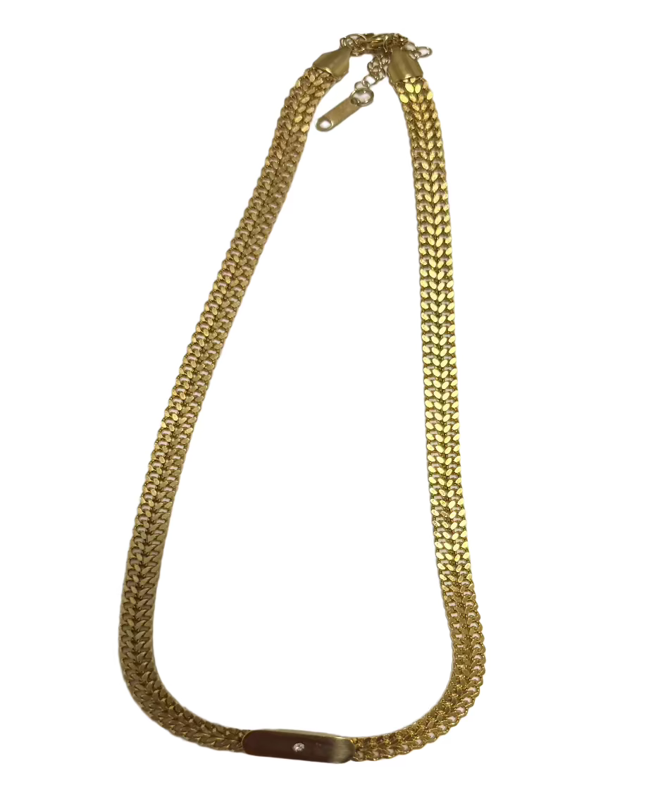 Just as the Myana Necklace, you'll find the same flexible "M" construction. At center, we have added a gold plate with a shining stone.
