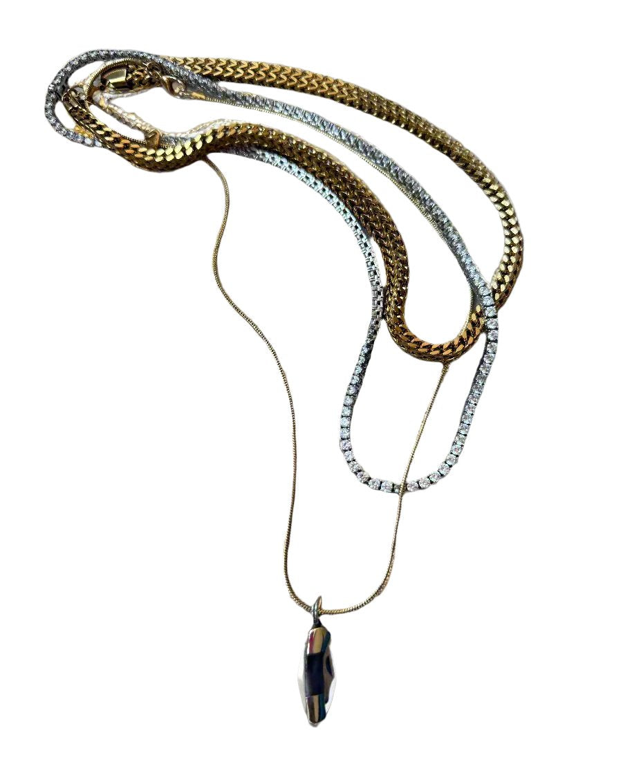 The classic 18" Tennis Necklace in White Gold, Our 15" Myana Link in Gold and our 18" Knives Out 2 Gold Snake chain w Abalone Knife pendant.